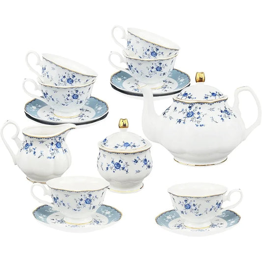 21 Piece Floral Porcelain Tea Set, British Tea Service Set for 6, Blue, Multi, Pink Options