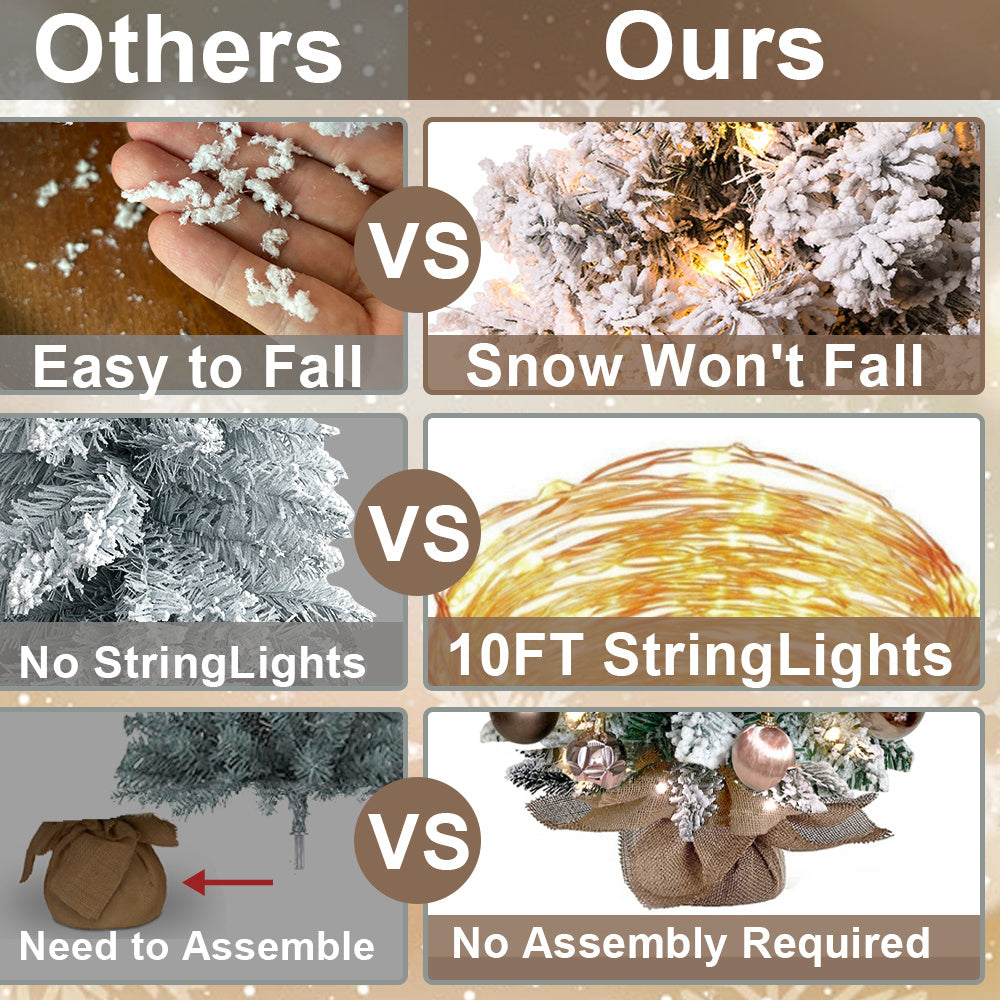 【Sturdy Flocked Snow】By more advanced manufacturing technique, the flocked snow stay firmly and evenly onto the leaves, which makes the mini christmas tree looks more lifelike.