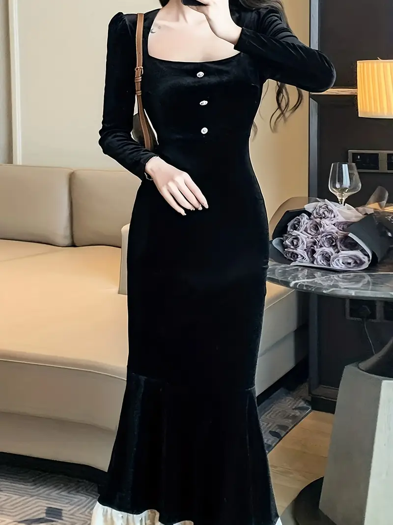 Elegant Contrast Lace Bodycon Dress with Square Neck and Long Sleeves for Women