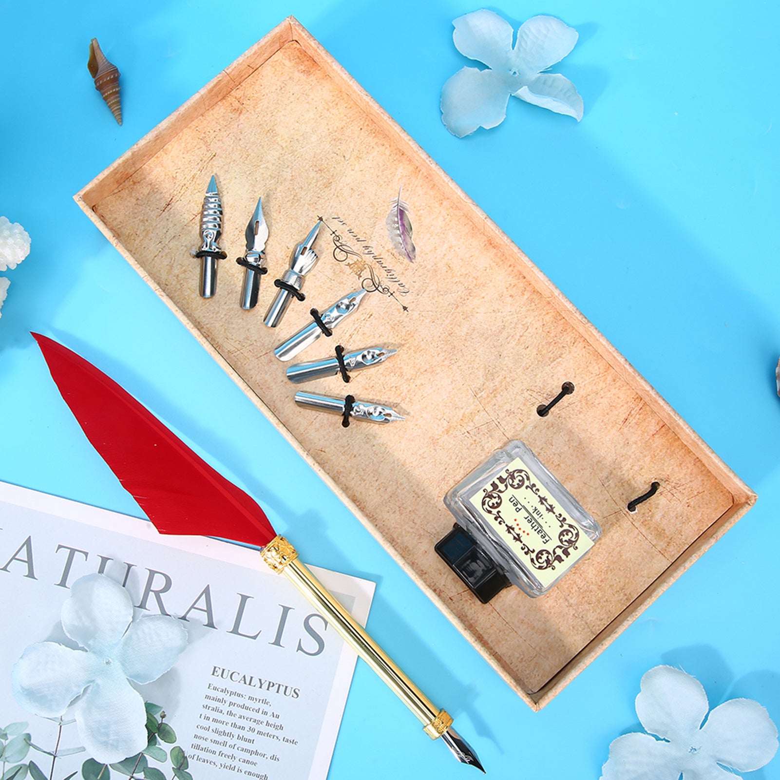 Vintage Style Calligraphic Feather Pen Kit Gift Box